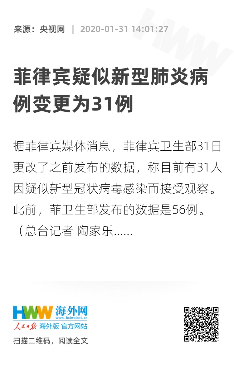 据菲律宾媒体消息,菲律宾卫生部31日更改了之前发布的数据,称目前有31人因疑似新型冠状病毒感染而接受观察。 此前,菲卫生部发布的数据是56例。(总台记者 陶家乐)
