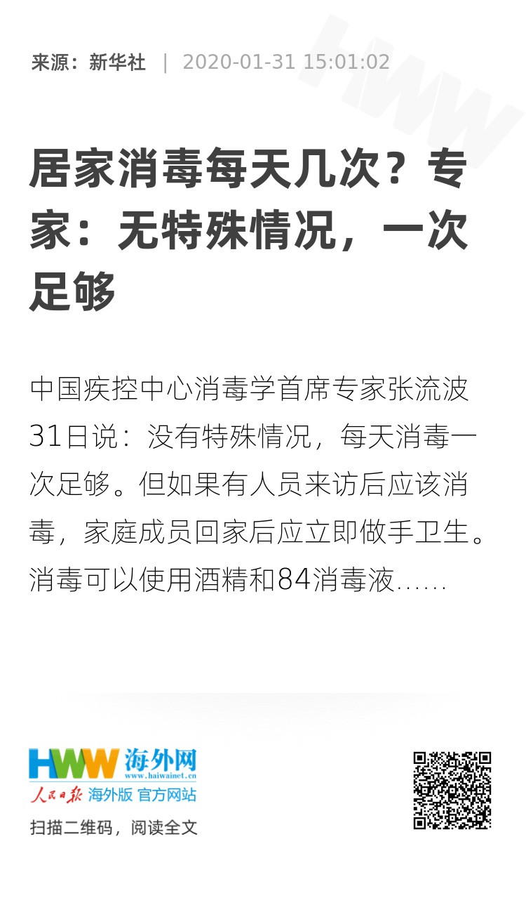 中国疾控中心消毒学首席专家张流波31日说:没有特殊情况,每天消毒一次足够。但如果有人员来访后应该消毒,家庭成员回家后应立即做手卫生。消毒可以使用酒精和84消毒液,但要按照说明书的方法去使用,不要盲目认为浓度越高越好,要做适当的稀释。(记者陈芳、陈聪)