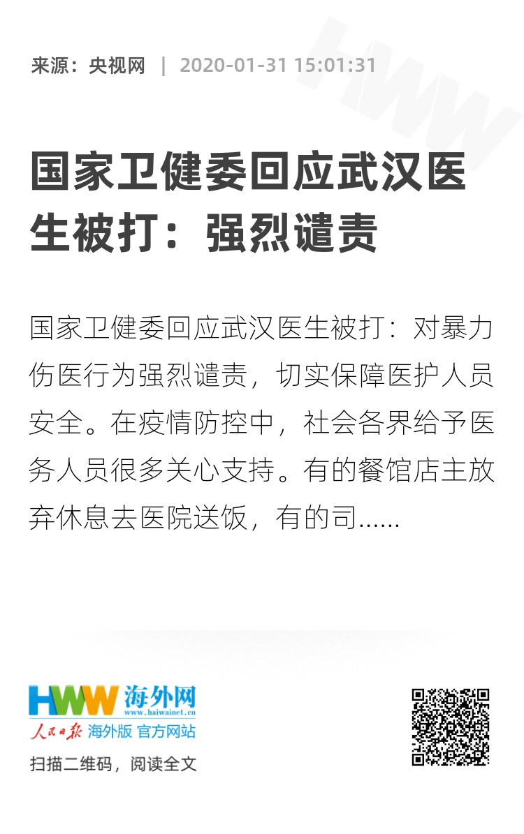 国家卫健委回应武汉医生被打:对暴力伤医行为强烈谴责,切实保障医护人员安全。