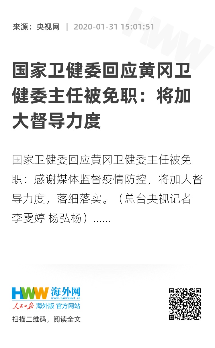 31707770,.国家卫健委回应黄冈卫健委主任被免职:将加大督导力度,.2020-01-31 15:36:51,.204442,.张婧妍