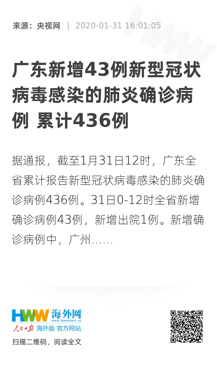 据通报,截至1月31日12时,广东全省累计报告新型冠状病毒感染的肺炎确诊病例436例。31日0-12时全省新增确诊病例43例,新增出院1例。新增确诊病例中,广州市6例、深圳市24例、珠海市8例、佛山市1例、惠州市3例、江门市1例。
