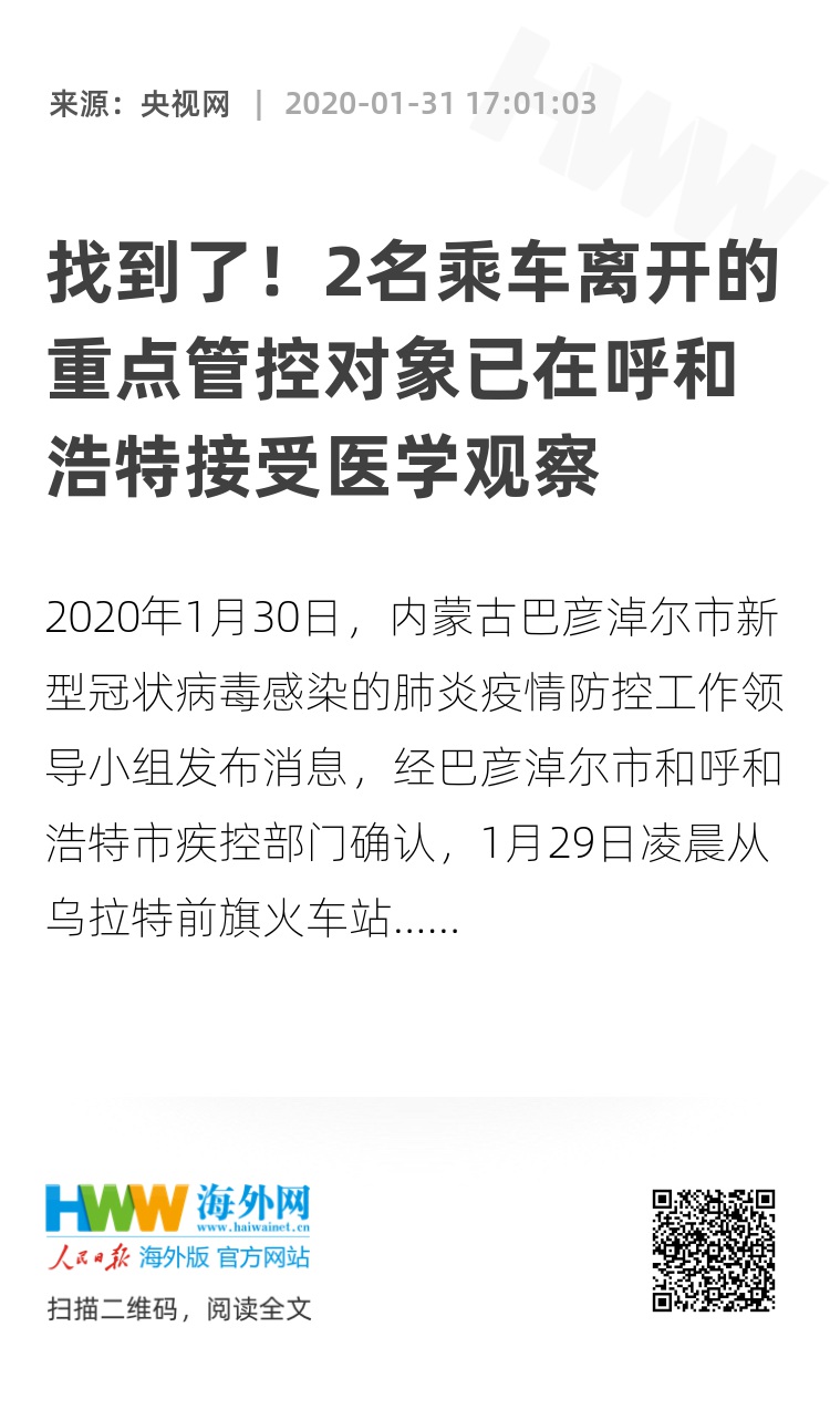 原标题:《找到了!乌拉特前旗两名离开的重点管控对象已在呼和浩特市接受医学观察》
