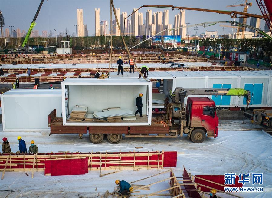 1月30日,在武汉雷神山医院建设工地,来自中建三局的工人在加紧施工(无人机照片)。新华社记者 肖艺九 摄