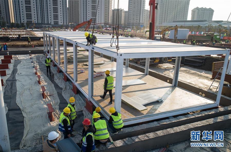 1月30日,在武汉雷神山医院建设工地,来自中建三局的工人在加紧施工(无人机照片)。新华社记者 肖艺九 摄