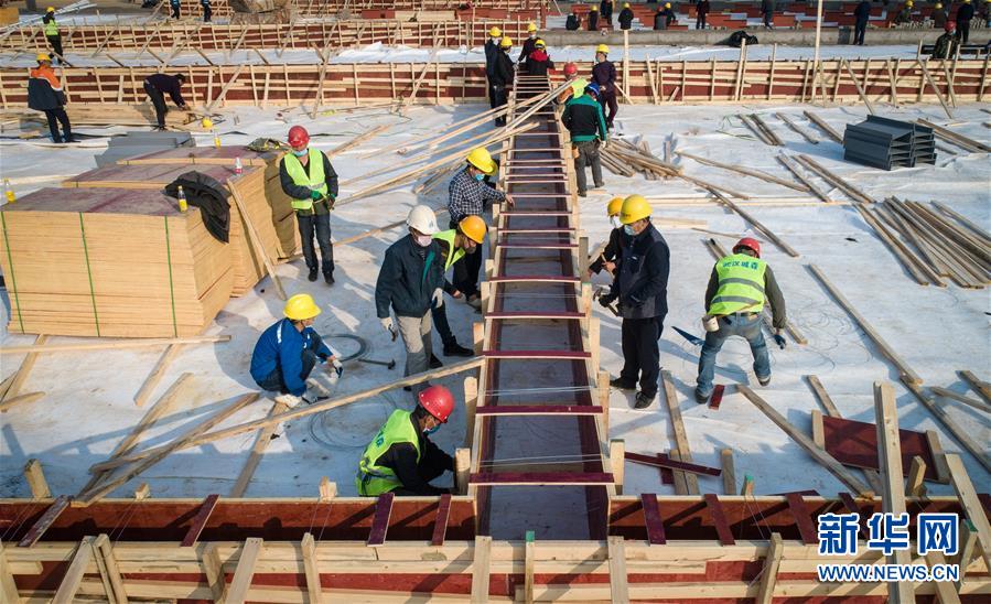 1月30日,在武汉雷神山医院建设工地,来自中建三局的工人在加紧施工(无人机照片)。新华社记者 肖艺九 摄