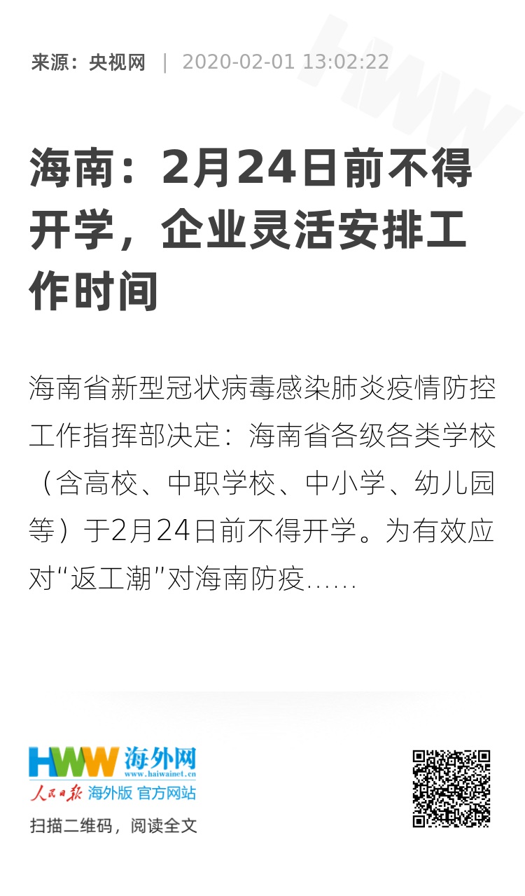海南省新型冠状病毒感染肺炎疫情防控工作指挥部决定:海南省各级各类学校(含高校、中职学校、中小学、幼儿园等)于2月24日前不得开学。