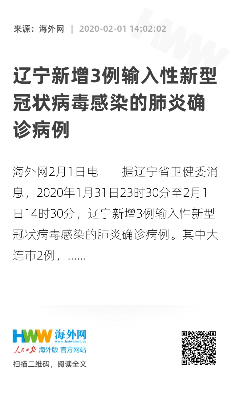 海外网2月1日电 据辽宁省卫健委消息,2020年1月31日23时30分至2月1日14时30分,辽宁新增3例输入性新型冠状病毒感染的肺炎确诊病例。其中大连市2例,阜新市1例。