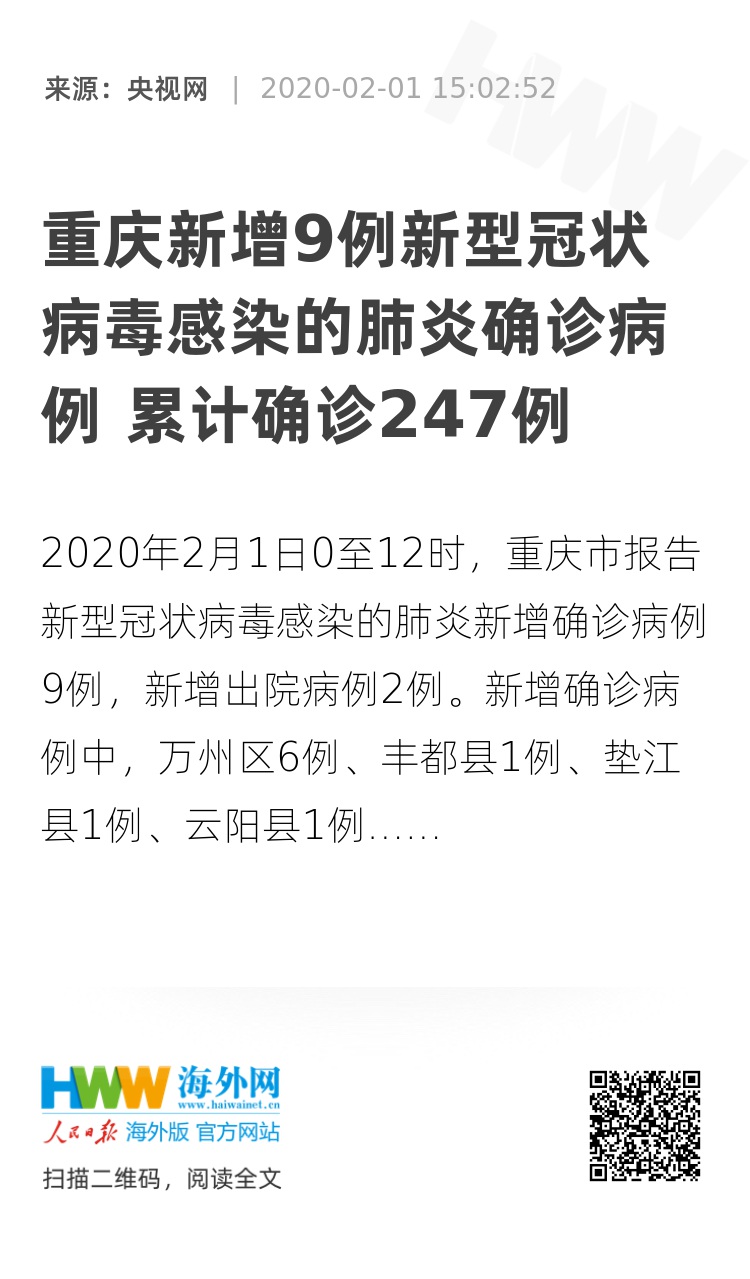 2020年2月1日0至12时,重庆市报告新型冠状病毒感染的肺炎新增确诊病例9例,新增出院病例2例。