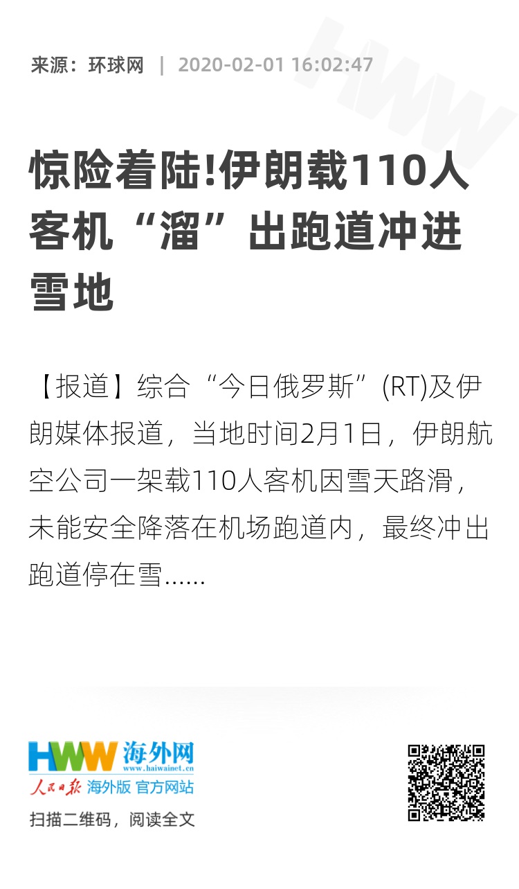 原标题:《再现“惊险”着陆!伊朗载110人客机“溜出”跑道冲进雪地》