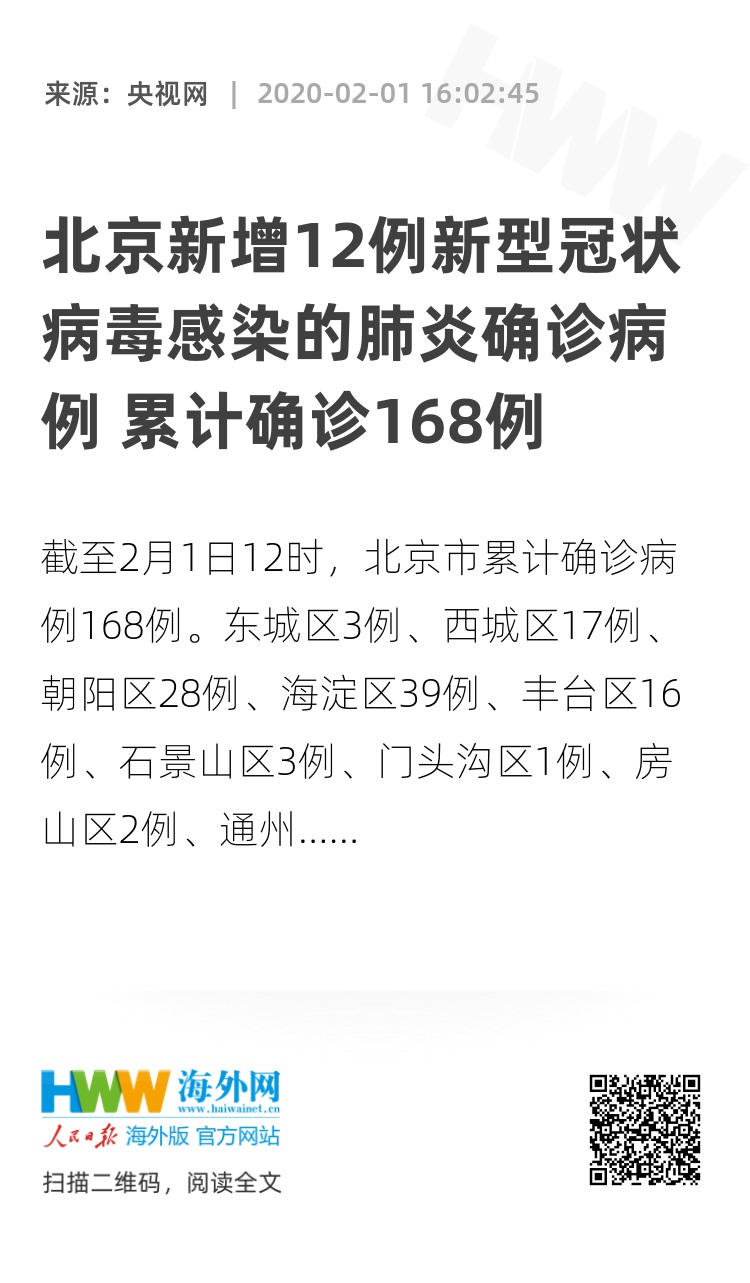 截至2月1日12时,北京市累计确诊病例168例。东城区3例、西城区17例、朝阳区28例、海淀区39例、丰台区16例、石景山区3例、门头沟区1例、房山区2例、通州区13例、顺义区2例、昌平区12例、大兴区20例、怀柔区1例、外地来京人员11例。平谷区、密云区、延庆区尚未有病例。