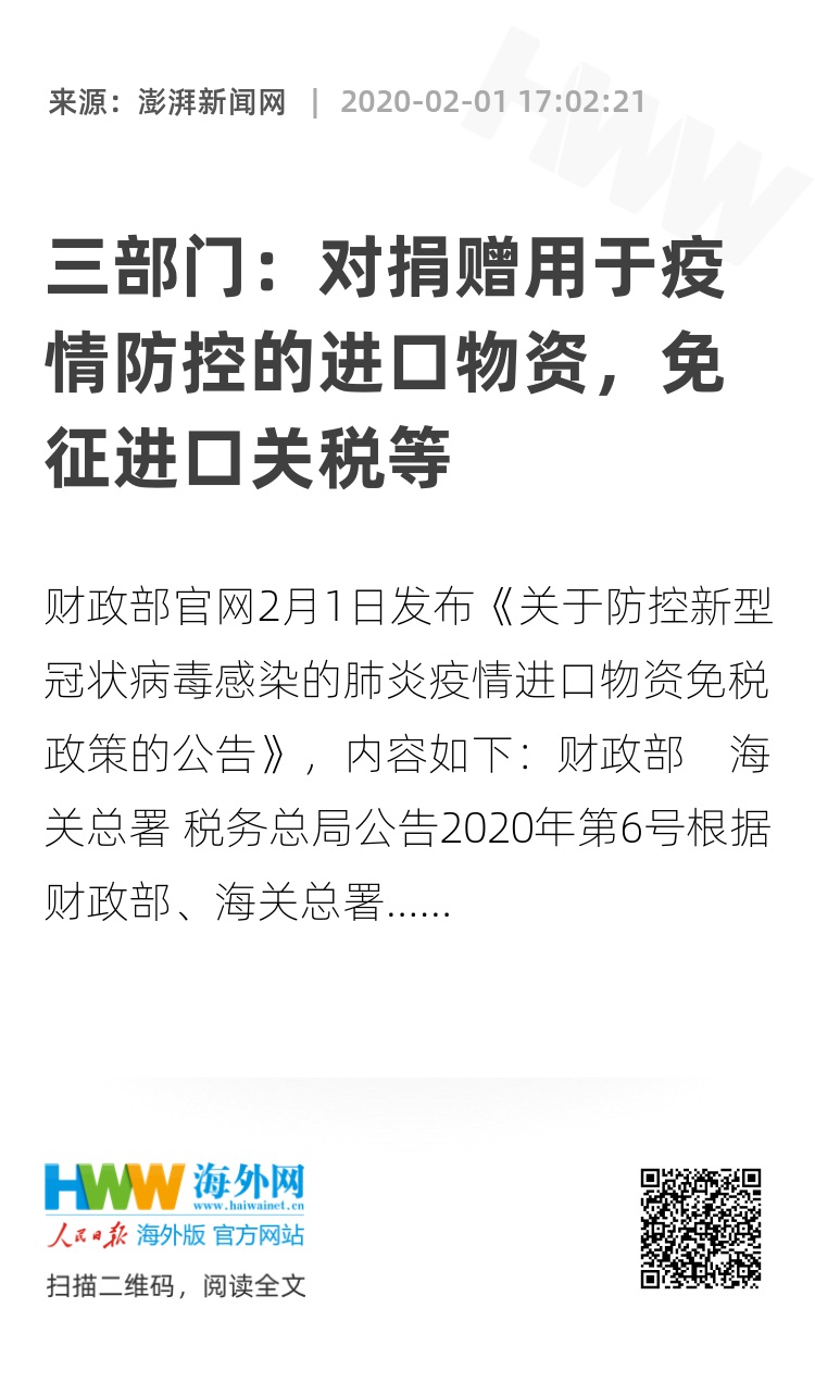 财政部官网2月1日发布《关于防控新型冠状病毒感染的肺炎疫情进口物资免税政策的公告》,内容如下: