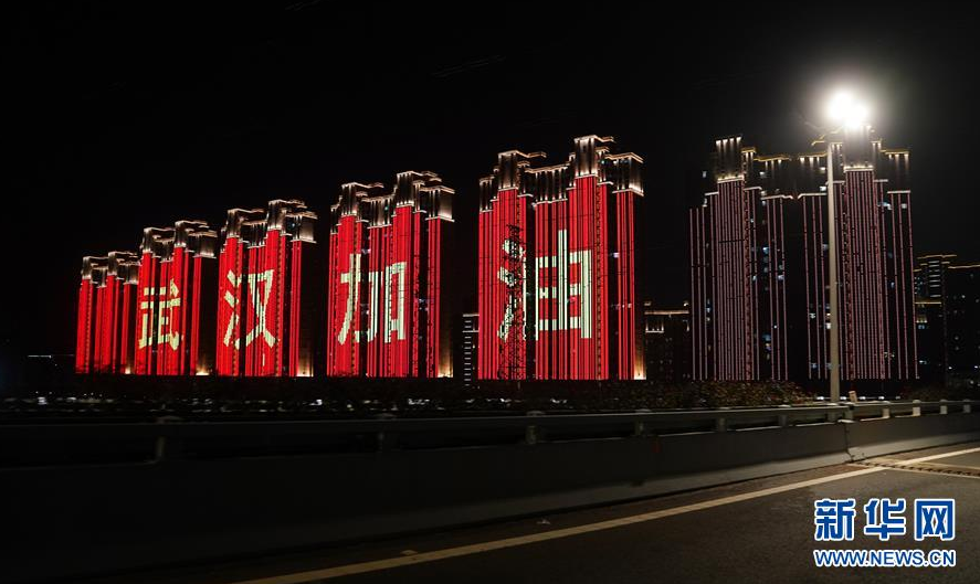 1月31日,武汉市汉口一处高层建筑外墙打出“武汉加油”字样。 新华社记者 程敏 摄