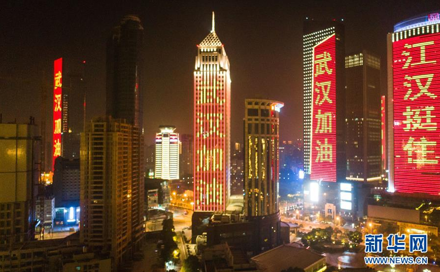 1月31日,武汉市江汉区西北湖附近高层建筑外墙打出“武汉加油”等字样。 新华社记者 肖艺九 摄