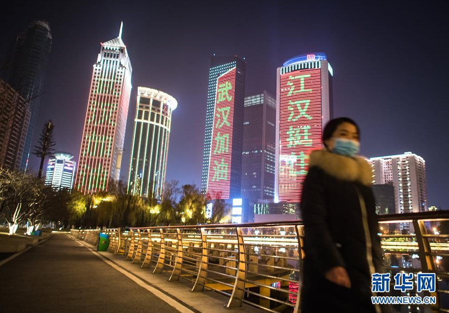 1月31日,武汉市江汉区西北湖附近高层建筑外墙打出“武汉加油”等字样。 新华社记者 肖艺九 摄
