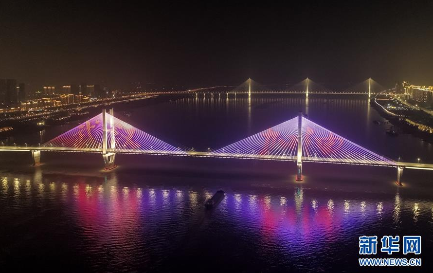 1月31日,武汉长江二桥打出“武汉加油”字样(无人机照片)。 新华社记者 程敏 摄