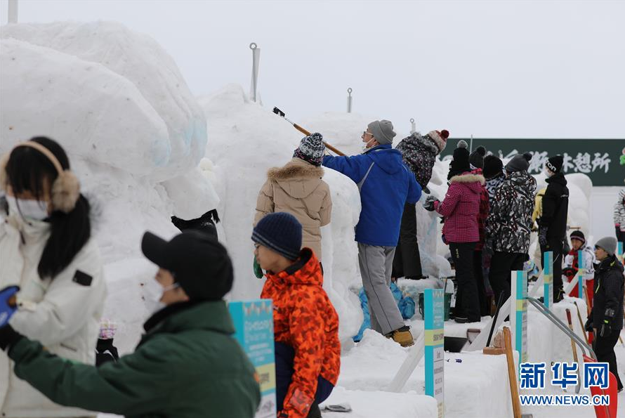 1月31日,在日本札幌,当地市民在活动现场制作雪雕。新华社记者 杜潇逸 摄