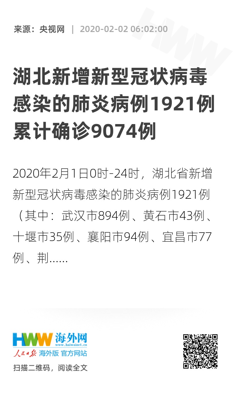 2020年2月1日0时-24时,湖北省新增新型冠状病毒感染的肺炎病例1921例(其中:武汉市894例、黄石市43例、十堰市35例、襄阳市94例、宜昌市77例、荆州市46例、荆门市78例、鄂州市51例、孝感市121例、黄冈市276例、咸宁市40例、随州市80例、恩施州18例、仙桃市43例、天门市17例、潜江市8例、神农架林区0例)。全省新增死亡45例 (其中:武汉市32例、荆门市2例、鄂州市4例、孝感市2例、黄冈市1例、随州市2例、仙桃市2例)。新增出院49例(其中:武汉市32例、黄石1例、荆门2例、黄冈市10例、随州市3例、恩施州1例)。