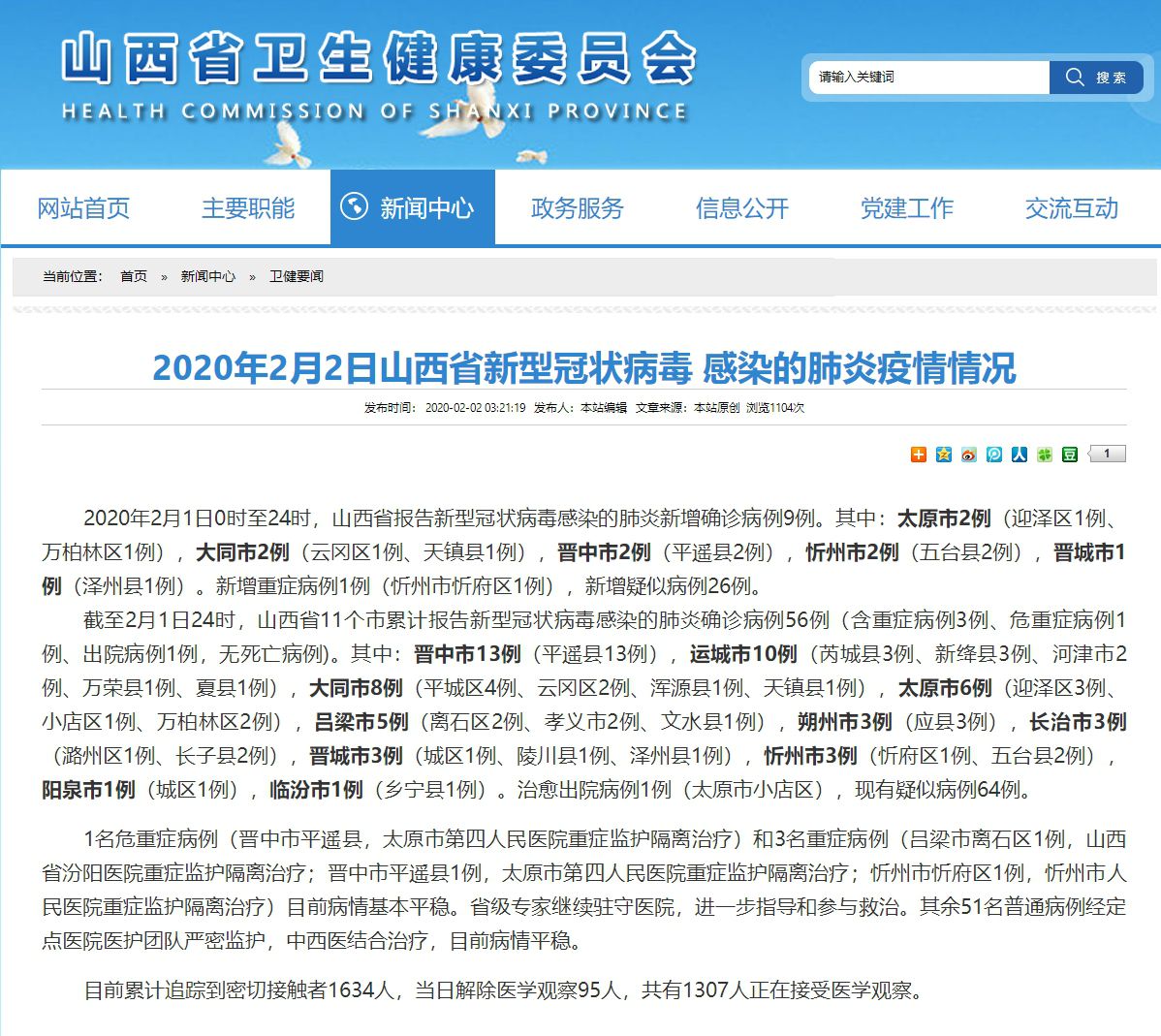 截至2月1日24时,山西省11个市累计报告新型冠状病毒感染的肺炎确诊病例56例(含重症病例3例、危重症病例1例、出院病例1例,无死亡病例)。其中:晋中市13例(平遥县13例),运城市10例(芮城县3例、新绛县3例、河津市2例、万荣县1例、夏县1例),大同市8例(平城区4例、云冈区2例、浑源县1例、天镇县1例),太原市6例(迎泽区3例、小店区1例、万柏林区2例),吕梁市5例(离石区2例、孝义市2例、文水县1例),朔州市3例(应县3例),长治市3例(潞州区1例、长子县2例),晋城市3例(城区1例、陵川县1例、泽州县1例),忻州市3例(忻府区1例、五台县2例),阳泉市1例(城区1例),临汾市1例(乡宁县1例)。治愈出院病例1例(太原市小店区),现有疑似病例64例。