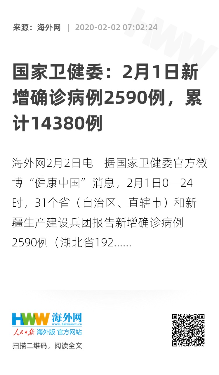 截至2月1日24时,国家卫生健康委收到31个省(自治区、直辖市)和新疆生产建设兵团累计报告确诊病例14380例,现有重症病例2110例,累计死亡病例304例,累计治愈出院病例328例,共有疑似病例19544例。