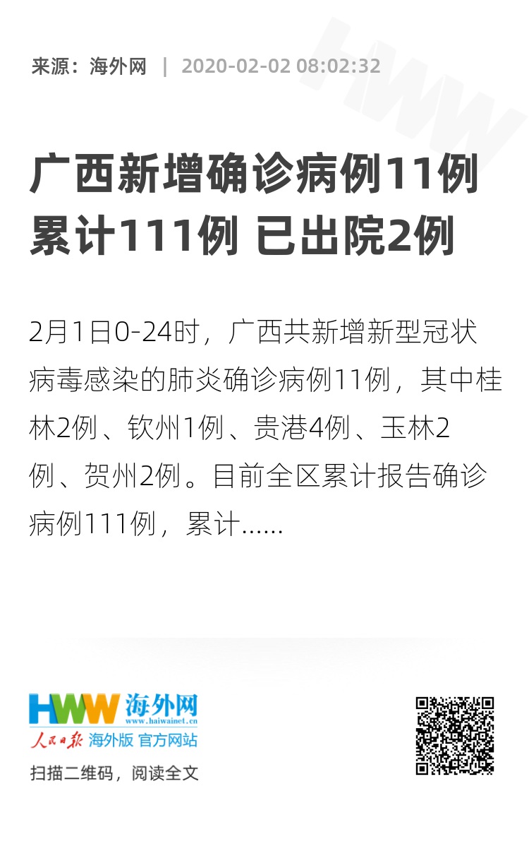 目前全区累计报告确诊病例111例,累计出院病例2例。现有重症病例6例(桂林2例、防城港3例、贵港1例),危重病例2例(桂林2例),无死亡病例,无医务人员感染病例。