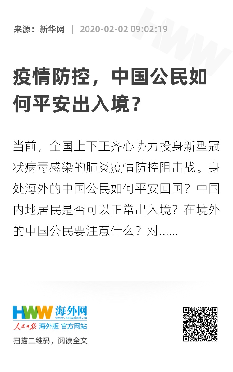 当前,全国上下正齐心协力投身新型冠状病毒感染的肺炎疫情防控阻击战。身处海外的中国公民如何平安回国?中国内地居民是否可以正常出入境?在境外的中国公民要注意什么?对此,记者采访了相关部门。