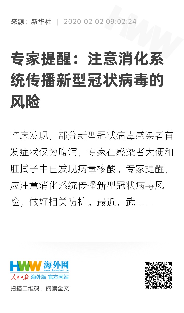 临床发现,部分新型冠状病毒感染者首发症状仅为腹泻,专家在感染者大便和肛拭子中已发现病毒核酸。专家提醒,应注意消化系统传播新型冠状病毒风险,做好相关防护。
