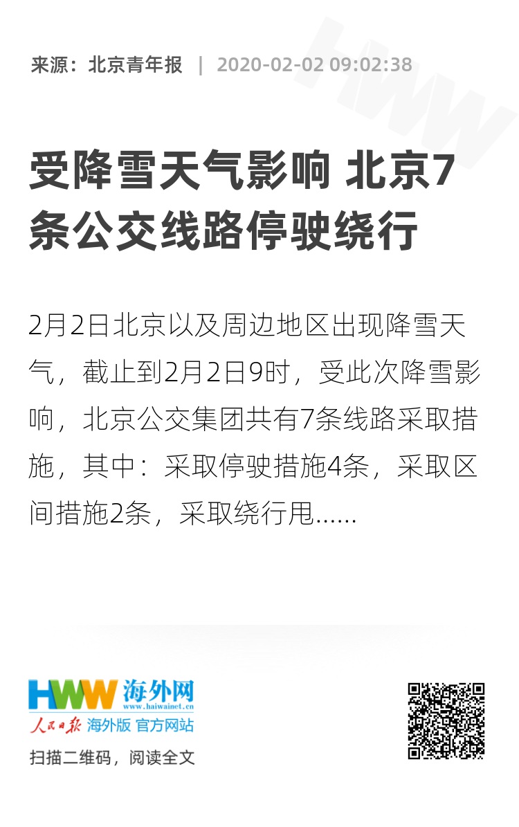 2月2日北京以及周边地区出现降雪天气,截止到2月2日9时,受此次降雪影响,北京公交集团共有7条线路采取措施,其中:采取停驶措施4条,采取区间措施2条,采取绕行甩站1条。具体措施如下: