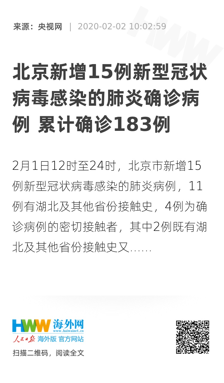 2月1日12时至24时,北京市新增15例新型冠状病毒感染的肺炎病例,11例有湖北及其他省份接触史,4例为确诊病例的密切接触者,其中2例既有湖北及其他省份接触史又是确诊病例的密切接触者。2例否认湖北接触史,正在进一步核实。均已送至定点医疗机构进行救治。