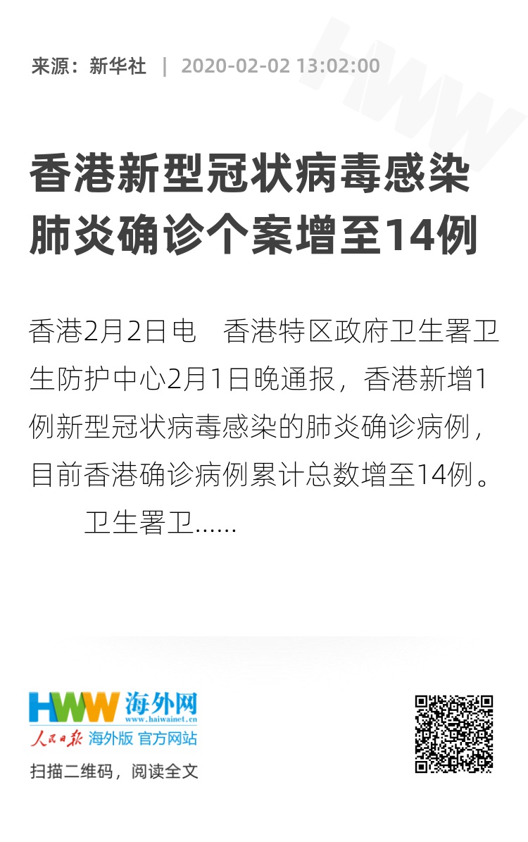 新华社香港2月2日电 香港特区政府卫生署卫生防护中心2月1日晚通报,香港新增1例新型冠状病毒感染的肺炎确诊病例,目前香港确诊病例累计总数增至14例。