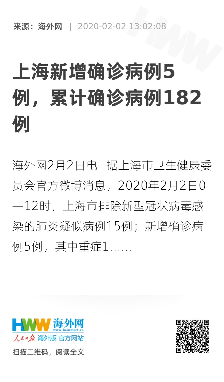 海外网2月2日电 据上海市卫生健康委员会官方微博消息,2020年2月2日0—12时,上海市排除新型冠状病毒感染的肺炎疑似病例15例;新增确诊病例5例,其中重症1例。确诊病例均为本市常住人口。具体情况如下图。