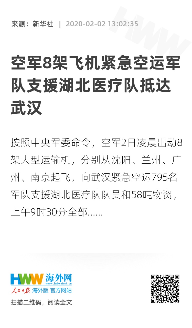 按照中央军委命令,空军2日凌晨出动8架大型运输机,分别从沈阳、兰州、广州、南京起飞,向武汉紧急空运795名军队支援湖北医疗队队员和58吨物资,上午9时30分全部抵达武汉天河机场。