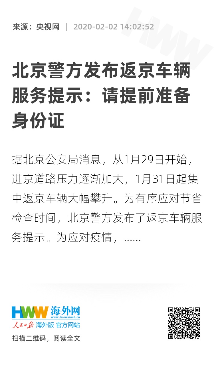 据北京公安局消息,从1月29日开始,进京道路压力逐渐加大,1月31日起集中返京车辆大幅攀升。为有序应对节省检查时间,北京警方发布了返京车辆服务提示。为应对疫情,除了常规检查外,检查站还增设了人员测温。民警与卫生防疫人员分工协作,对驾乘人员进行健康情况监测筛查,对体温异常人员及时进行登记并落实专业防控措施。