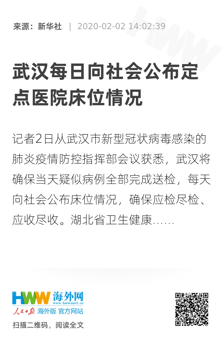 记者2日从武汉市新型冠状病毒感染的肺炎疫情防控指挥部会议获悉,武汉将确保当天疑似病例全部完成送检,每天向社会公布床位情况,确保应检尽检、应收尽收。