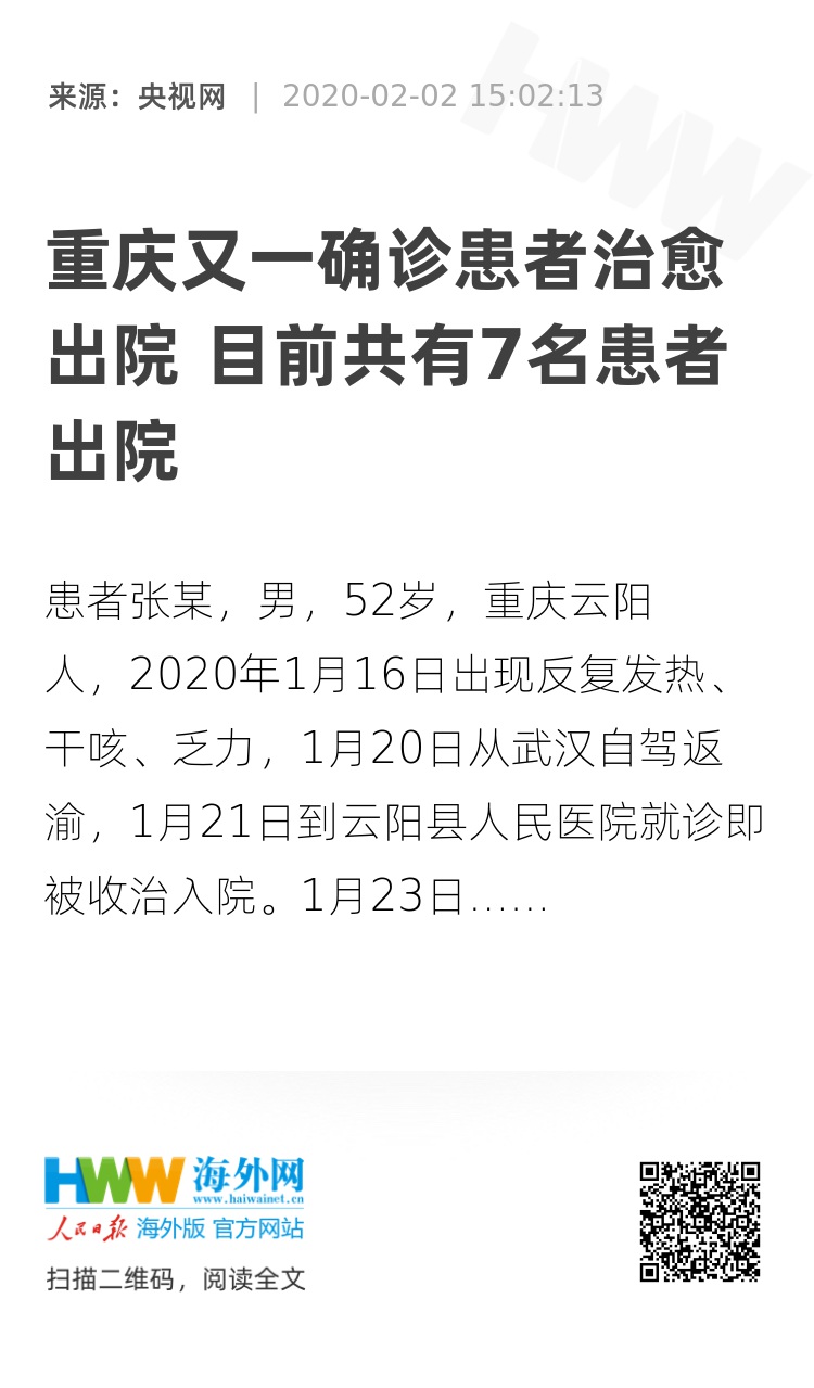 目前,重庆市已有7名新型冠状病毒感染的肺炎患者治愈出院。(总台央视记者 唐巍 伍黎明)