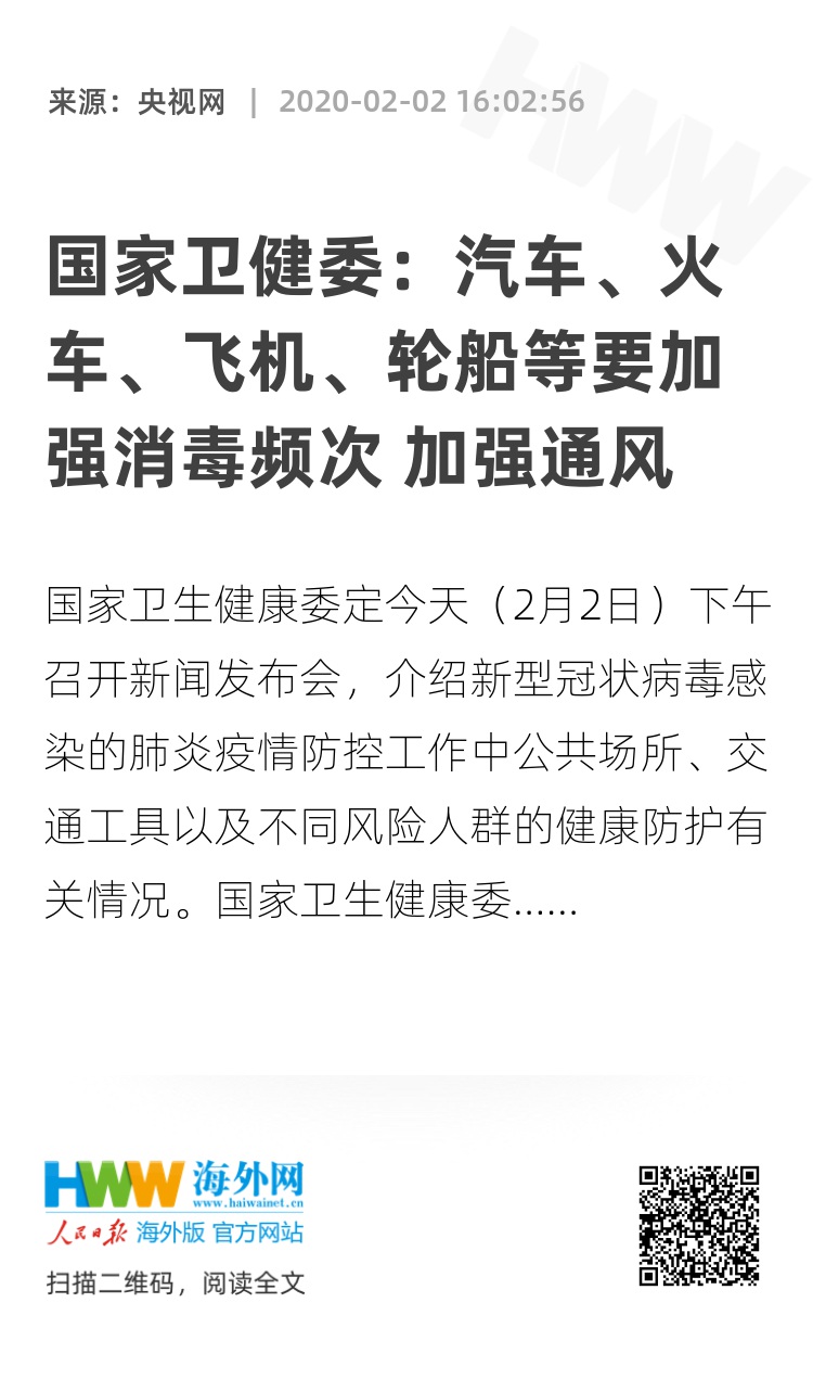 国家卫生健康委定今天(2月2日)下午召开新闻发布会,介绍新型冠状病毒感染的肺炎疫情防控工作中公共场所、交通工具以及不同风险人群的健康防护有关情况。国家卫生健康委疾控局副局长王斌在回答记者提问时表示,随着假期临近结束,各行各业的人们将要返回到工作岗位,针对这样防控的形势,汽车、火车、飞机、轮船等公共交通工具要加强消毒频次,加强通风。如果要乘坐火车、飞机,要尽可能隔位而坐,或者分散而坐。