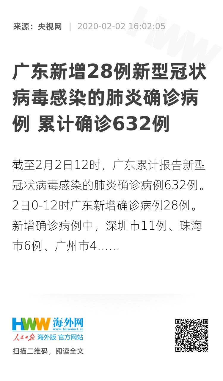截至2月2日12时,广东累计报告新型冠状病毒感染的肺炎确诊病例632例。2日0-12时广东新增确诊病例28例。新增确诊病例中,深圳市11例、珠海市6例、广州市4例、佛山市4例、汕头市1例、梅州市1例、潮州市1例。有2504名密切接触者正在接受医学观察。
