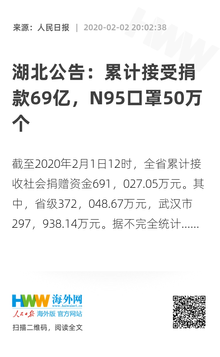 截至2020年2月1日12时,全省累计接收社会捐赠资金691,027.05万元。其中,省级372,048.67万元,武汉市297,938.14万元。