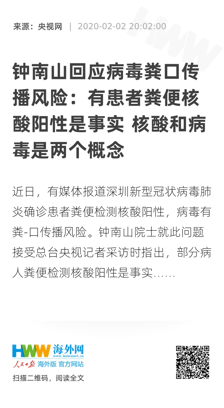 钟南山院士就此问题接受总台央视记者采访时指出,部分病人粪便检测核酸阳性是事实,应该高度关注。假如真的分离出病毒,粪-口传播的可能性就增加了,现在密切观察。