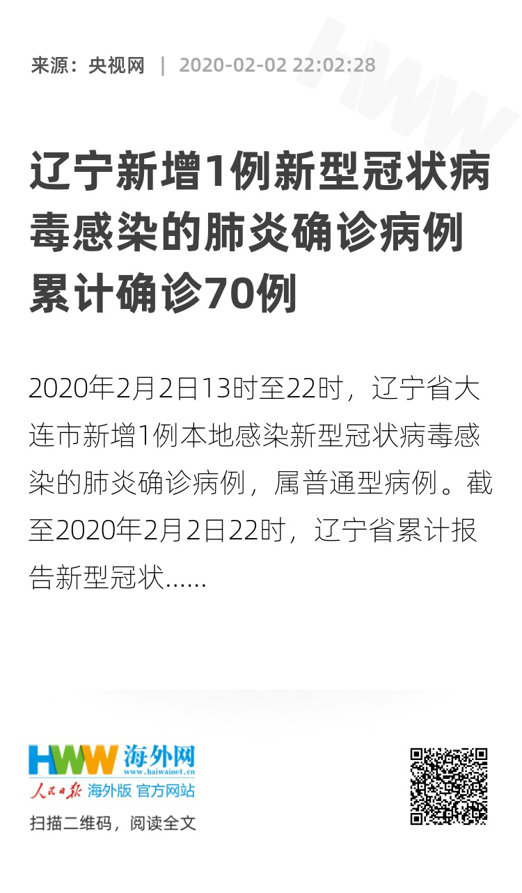 2020年2月2日13时至22时,辽宁省大连市新增1例本地感染新型冠状病毒感染的肺炎确诊病例,属普通型病例。