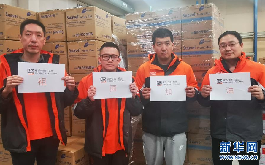 1月31日,在芬兰赫尔辛基,快递公司员工手举印有“祖国加油”字样的纸板。 疫情牵动海外华侨华人的心,他们时刻关注着中国国内发生的新型冠状病毒感染的肺炎疫情。不少旅居世界各地的海外华侨华人听闻后纷纷行动起来,助力国内疫情防控。 新华社发(佟帅摄)