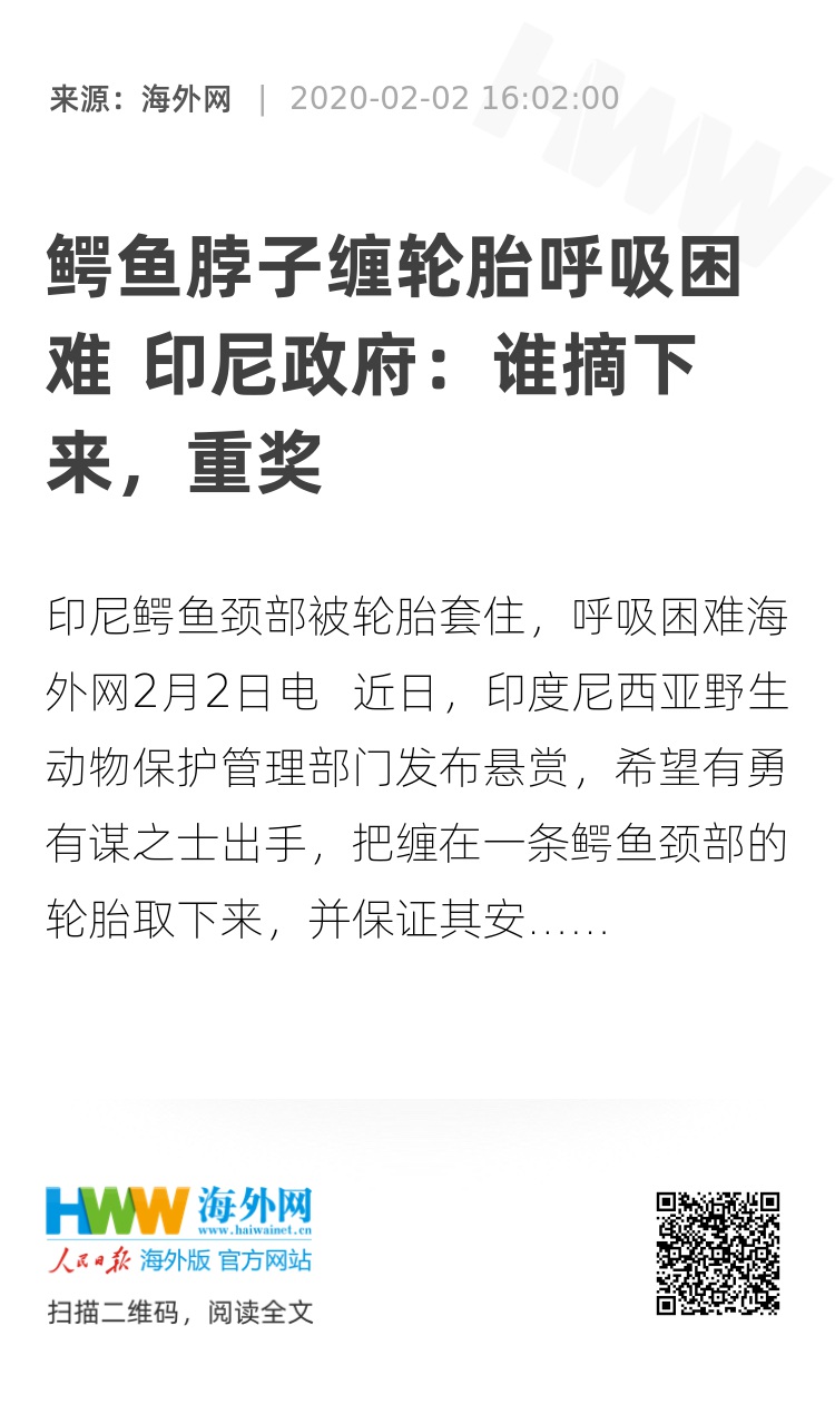 海外网2月2日电 近日,印度尼西亚野生动物保护管理部门发布悬赏,希望有勇有谋之士出手,把缠在一条鳄鱼颈部的轮胎取下来,并保证其安全存活,若能完成任务,此人将获得一笔丰厚的奖金,但奖金数目不详。