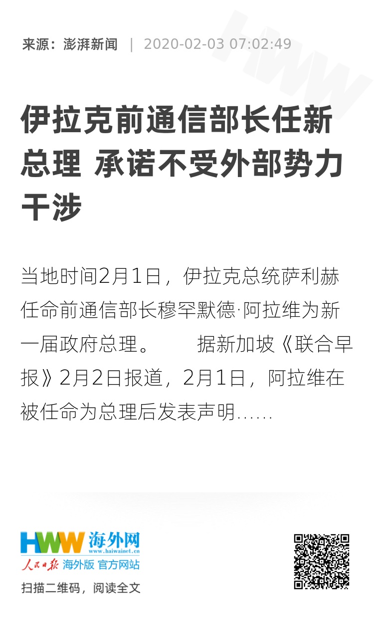 据新加坡《联合早报》2月2日报道,2月1日,阿拉维在被任命为总理后发表声明称,他承诺将重振伊拉克经济,打击腐败。