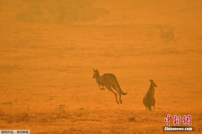 当地时间1月4日,澳大利亚Cooma,两只袋鼠在浓烟弥漫的田野上跳跃。