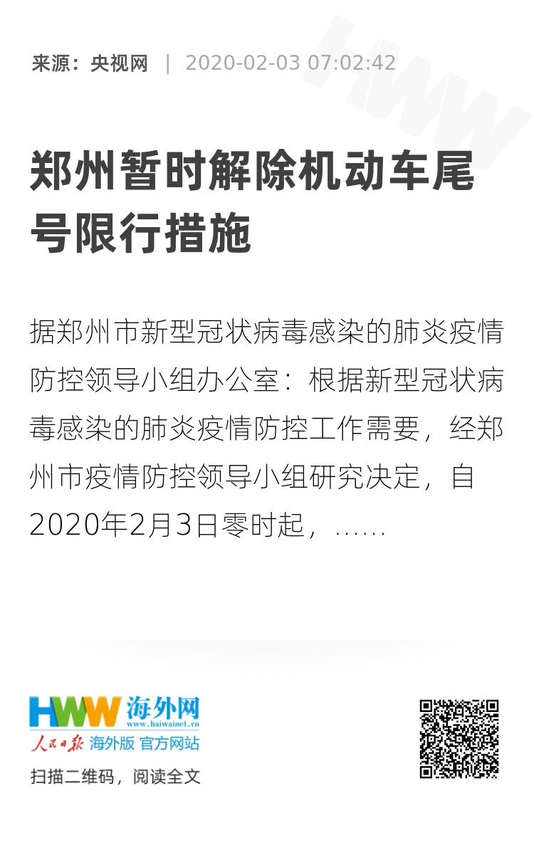 根据新型冠状病毒感染的肺炎疫情防控工作需要,经郑州市疫情防控领导小组研究决定,自2020年2月3日零时起,暂时解除郑州市因大气污染防治工作实施的机动车尾号限行措施,如有变化另行通告。(总台央视记者 田萌)