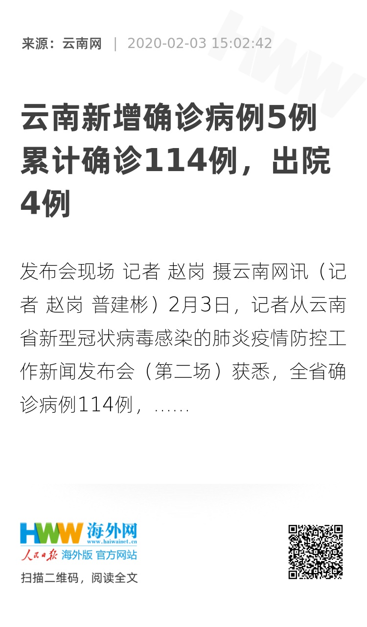 省应对疫情工作领导小组指挥部办公室副主任陆林介绍,2月2日0时至24时,云南省新增病例10例。2月3日0时至12时,云南省新增病例5例。截至2月3日12时,全省累计报告新型冠状病毒感染的肺炎确诊病例114例,现有危重症3例、重症7例,无死亡病例。全省现有疑似病例216例。3592例密切接触者正在接受医学观察,累计1438例密切接触者已解除隔离。4名确诊病例治愈出院。