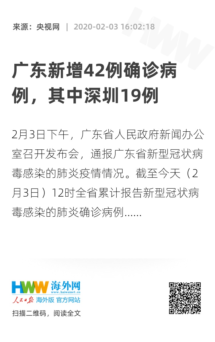 截至今天(2月3日)12时全省累计报告新型冠状病毒感染的肺炎确诊病例725例,2月3日0到12时全省新增确诊病例42例,新增确诊病例中深圳19例,截至今天12时,危重22例,重症58例,普通型631例,累计出院14例,无死亡病例。(总台央视记者 张莉莉)