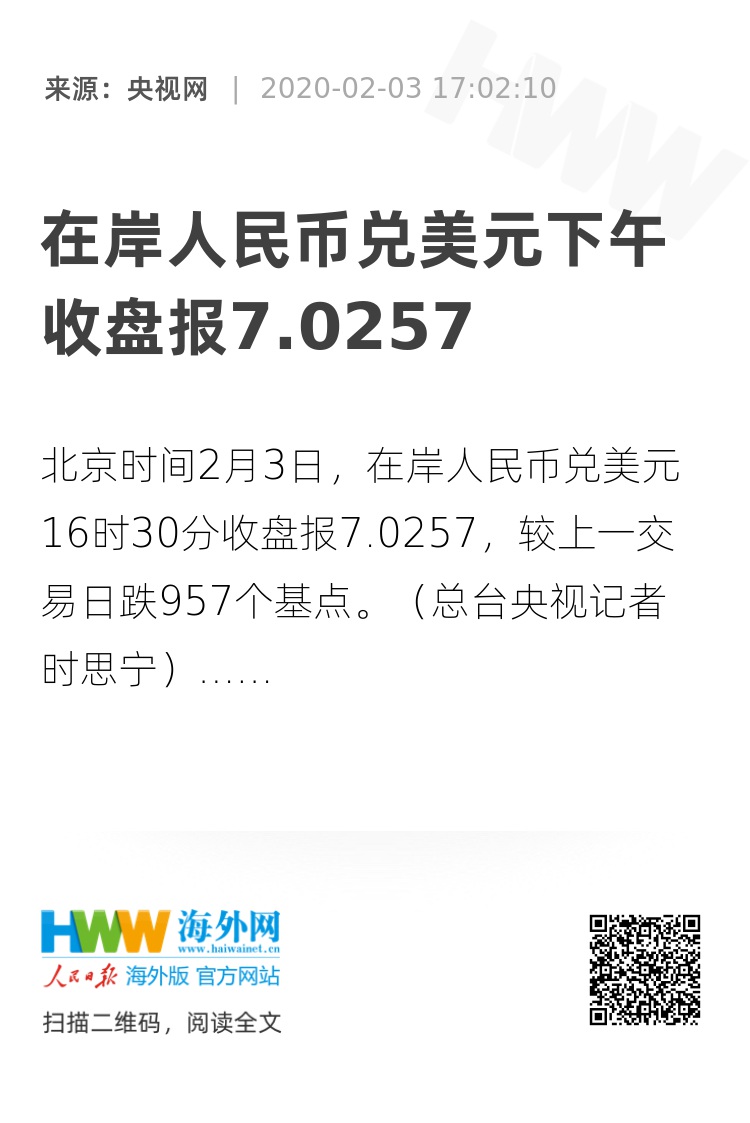 北京时间2月3日,在岸人民币兑美元16时30分收盘报7.0257,较上一交易日跌957个基点。(总台央视记者 时思宁)