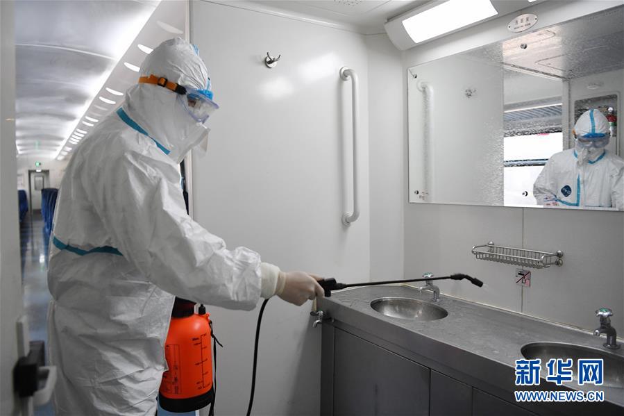 2月3日,中国铁路兰州局集团有限公司疾病预防控制所工作人员杨凯在K9668次列车上进行消毒作业。 为做好新型冠状病毒感染的肺炎疫情防控工作,中国铁路兰州局集团有限公司疾病预防控制所的工作人员近期全天候轮班上岗,对兰州火车站的列车开展消毒防疫工作,确保列车重点部位经过严格细致的消毒。 新华社记者 陈斌 摄