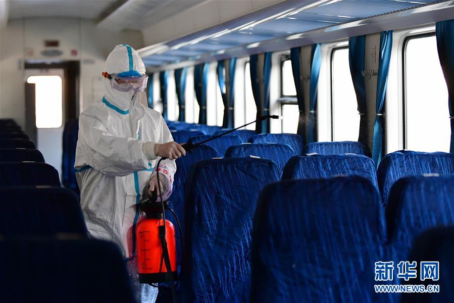 2月3日,中国铁路兰州局集团有限公司疾病预防控制所工作人员杨凯在K9668次列车上进行消毒作业。 为做好新型冠状病毒感染的肺炎疫情防控工作,中国铁路兰州局集团有限公司疾病预防控制所的工作人员近期全天候轮班上岗,对兰州火车站的列车开展消毒防疫工作,确保列车重点部位经过严格细致的消毒。 新华社记者 陈斌 摄