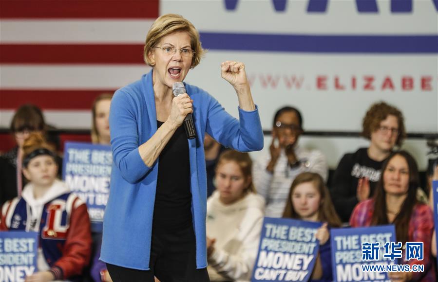 2月1日,在美国艾奥瓦州艾奥瓦城,美国民主党竞选人、马萨诸塞州联邦参议员伊丽莎白·沃伦在竞选活动上讲话。 美国中部时间2月3日晚7时起,位于美国中西部的艾奥瓦州将在逾1600个选区举行民主党和共和党总统选举首场党内预选,正式拉开2020年美国总统选举序幕。 新华社发(乔尔·莱纳摄)